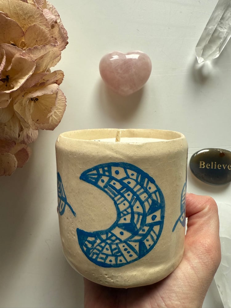 Une bougie coulée dans une tasse en céramique modelée par mes soins.