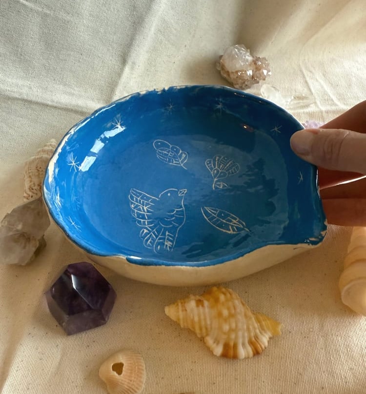 Caractéristiques durables 🍃 – Céramique faite main, modelée, peinte, cuite et émaillée avec une émaille sans plomb – Émaillage non toxique, sans danger pour les aliments – Chaque pièce est unique : de légères variations ou imperfections peuvent apparaître, signe du travail artisanal – Lavage à la main recommandé – Résistante aux chocs et aux rayures – Emballée avec soin dans du papier à bulles, puis dans un paquet cadeau 🌸 – Le prix est valable pour une pièce unique
