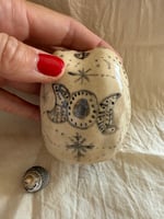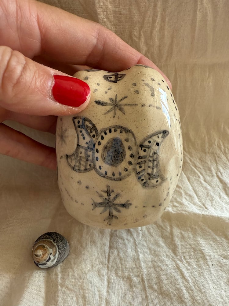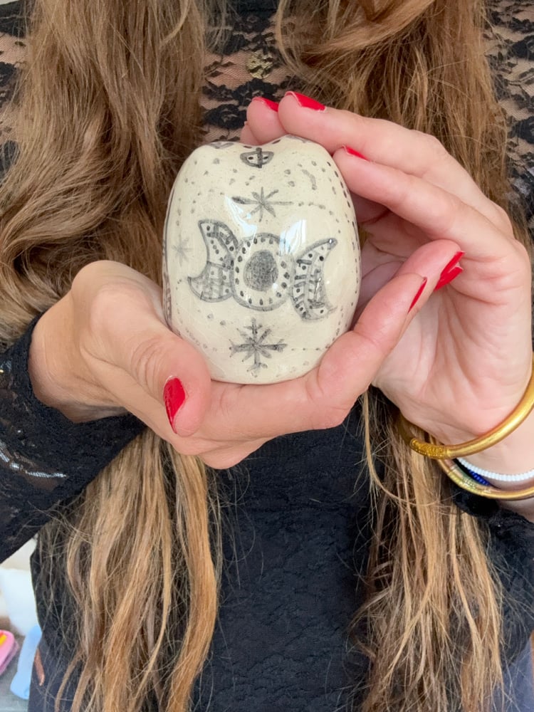 Et, découvre le charme des motifs dessinés à la main mettant en vedette des étoiles, comètes, la Lune, le Soleil, les plumes, les oiseaux aussi… ici, dans la couleur noire, avec mes pièces, en céramique, fabriquées à la main.
