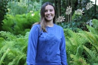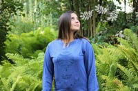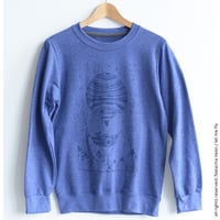 Pullover bleu avec une illustration d'une montgolfière dans les nuages reproduite à la sérigraphie