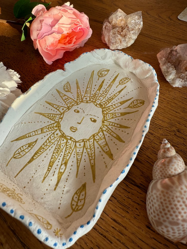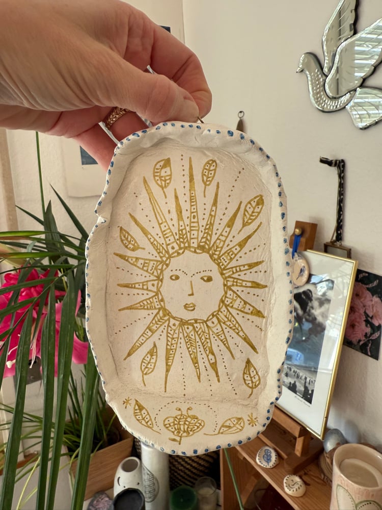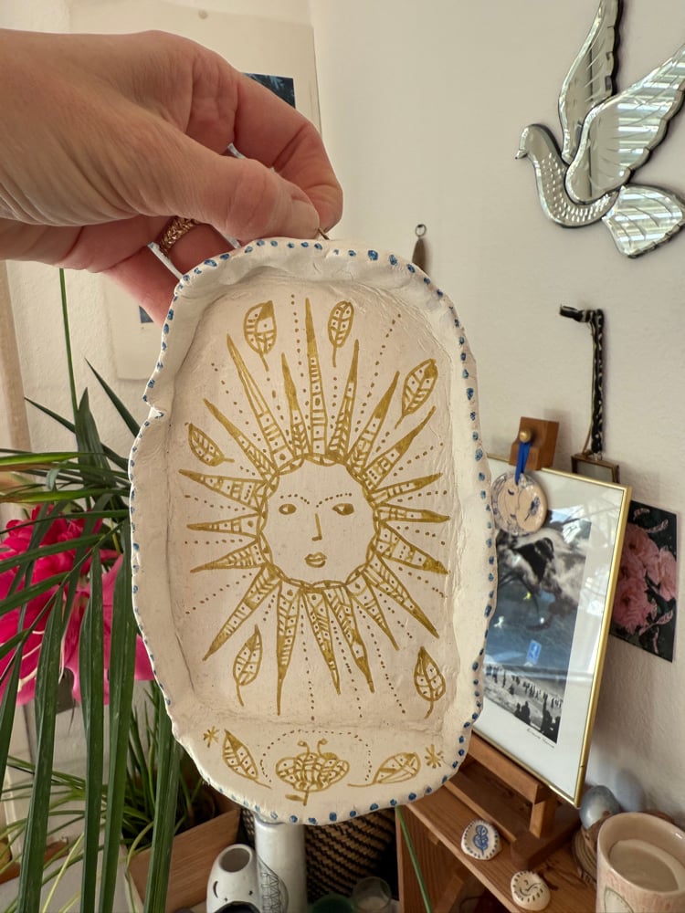 Je les ai réalisées en argile, puis je les ai peintes à l'acrylique et je les ai vernis, derrière j'ai collé un crochet pour que vous puissiez l'accrocher au mur si vous le souhaitez. ☀️